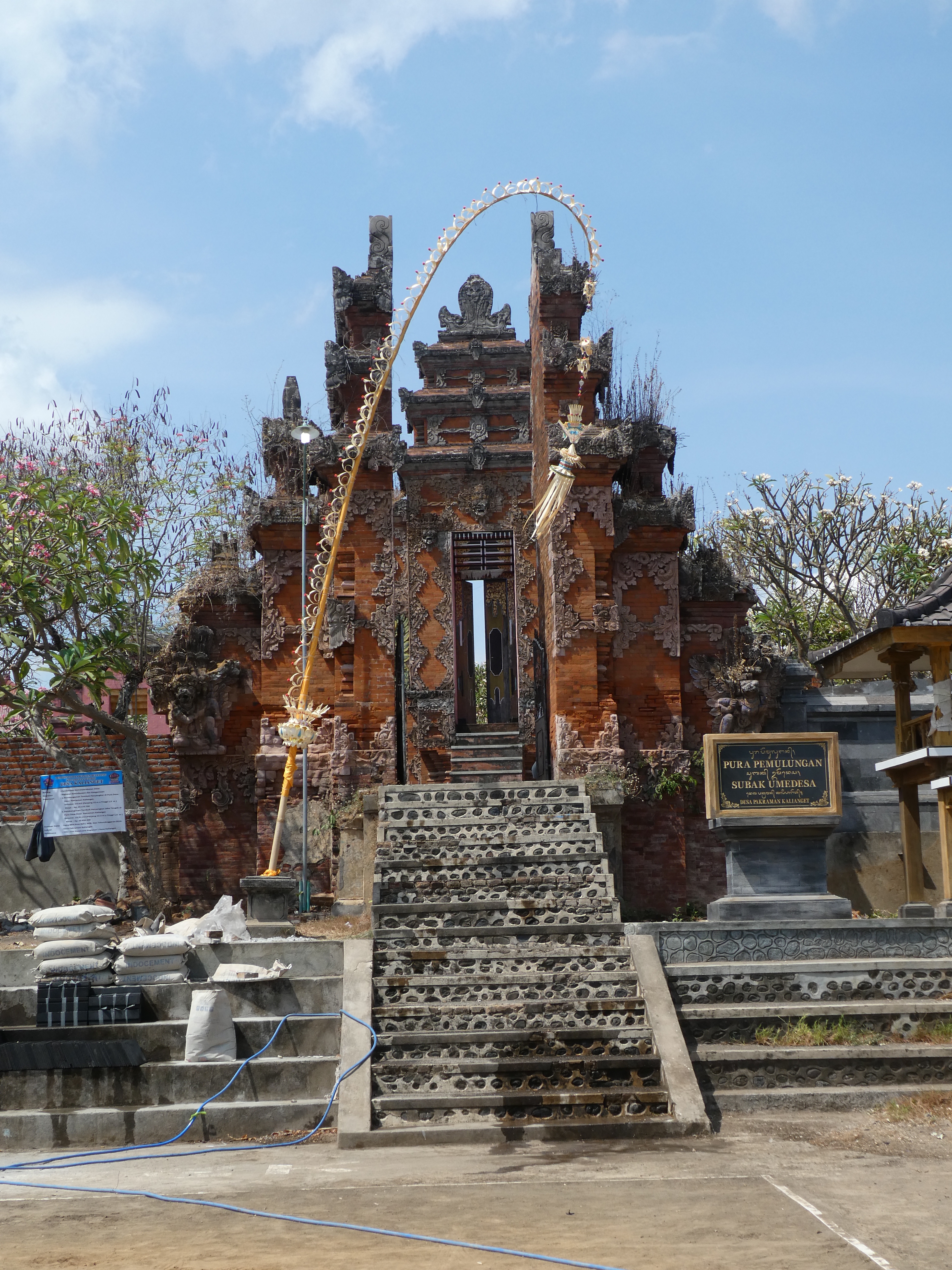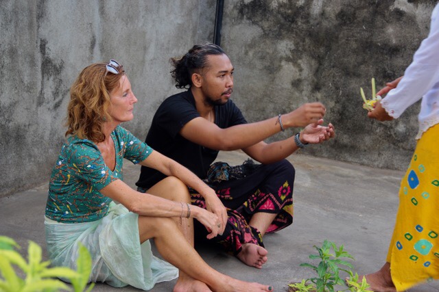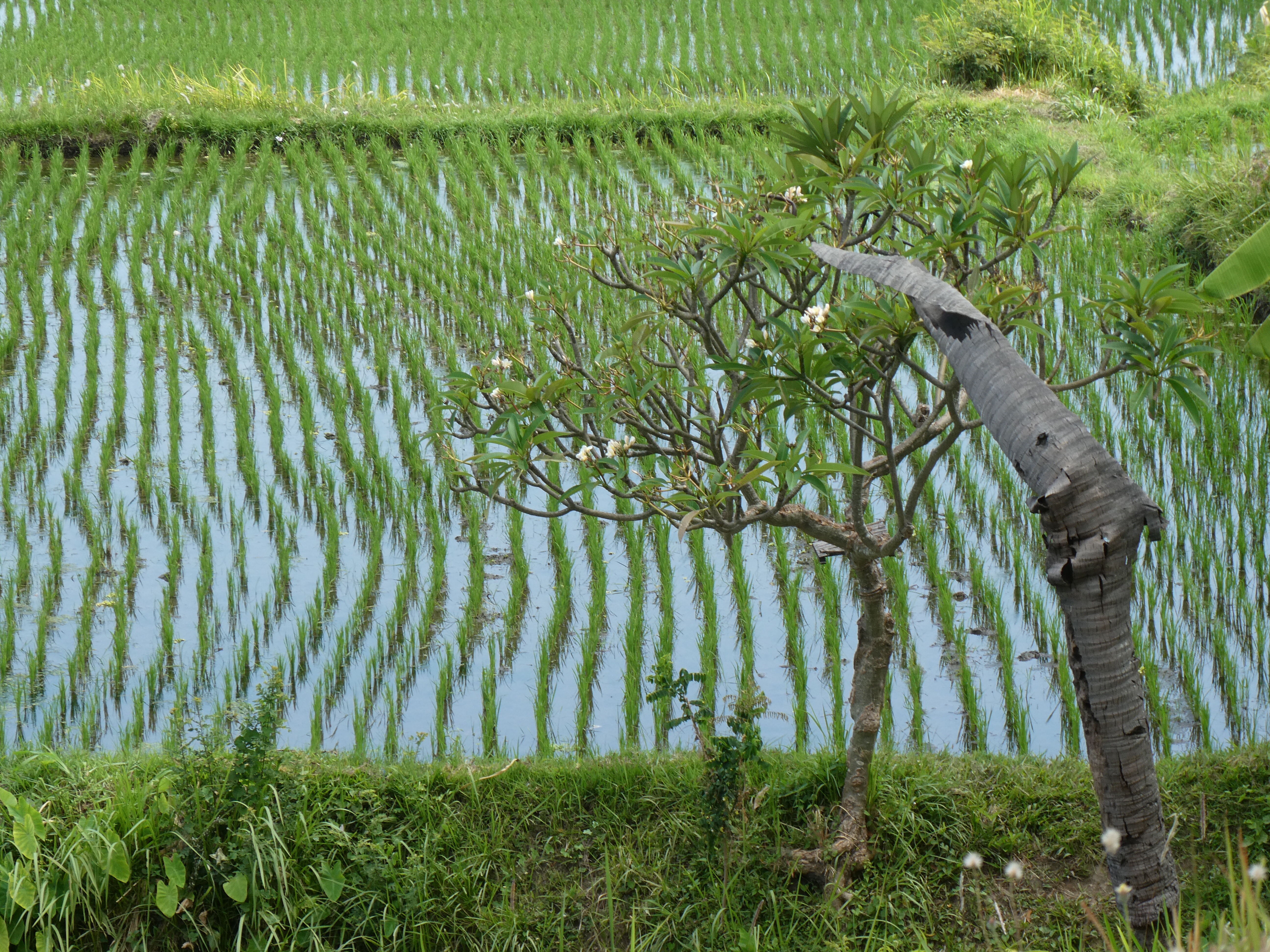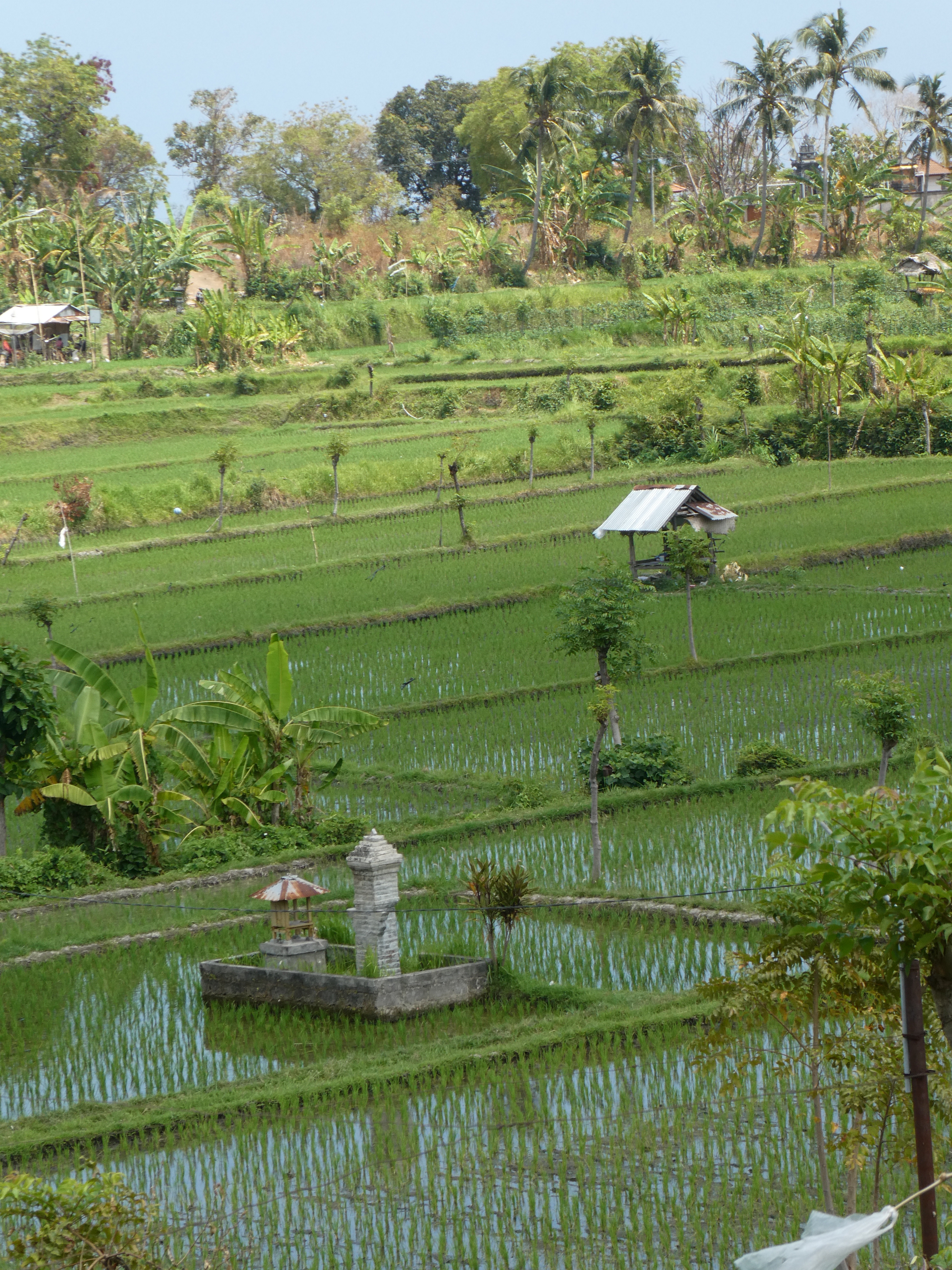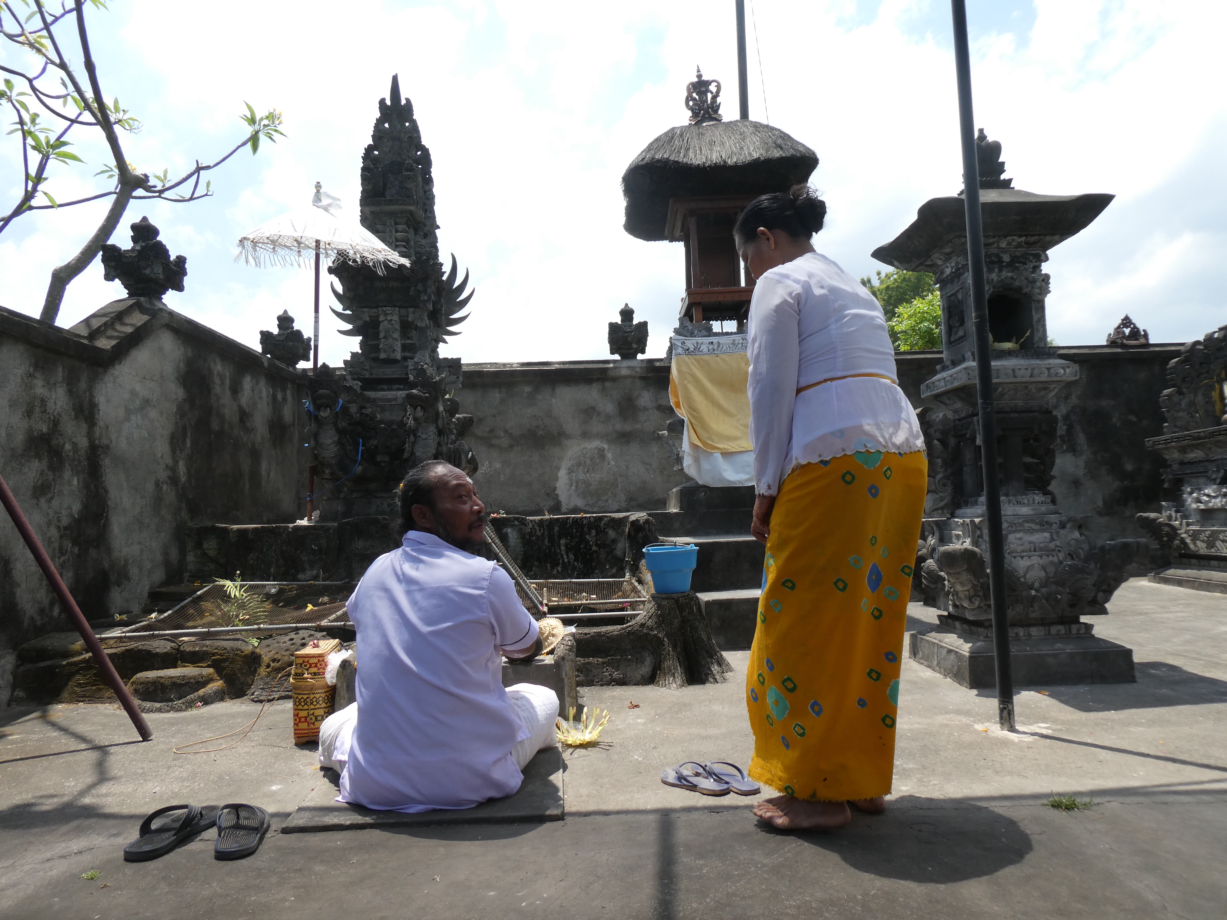 Een idyllisch plaatje van betoverend groene rijstvelden, omringd met hoge palm- en bananen bomen, witte bloesems wuivend in de wind, en in het midden een kleine open tempel waar de dorpspriester ons al opwacht voor een intieme zuiveringsceremonie.